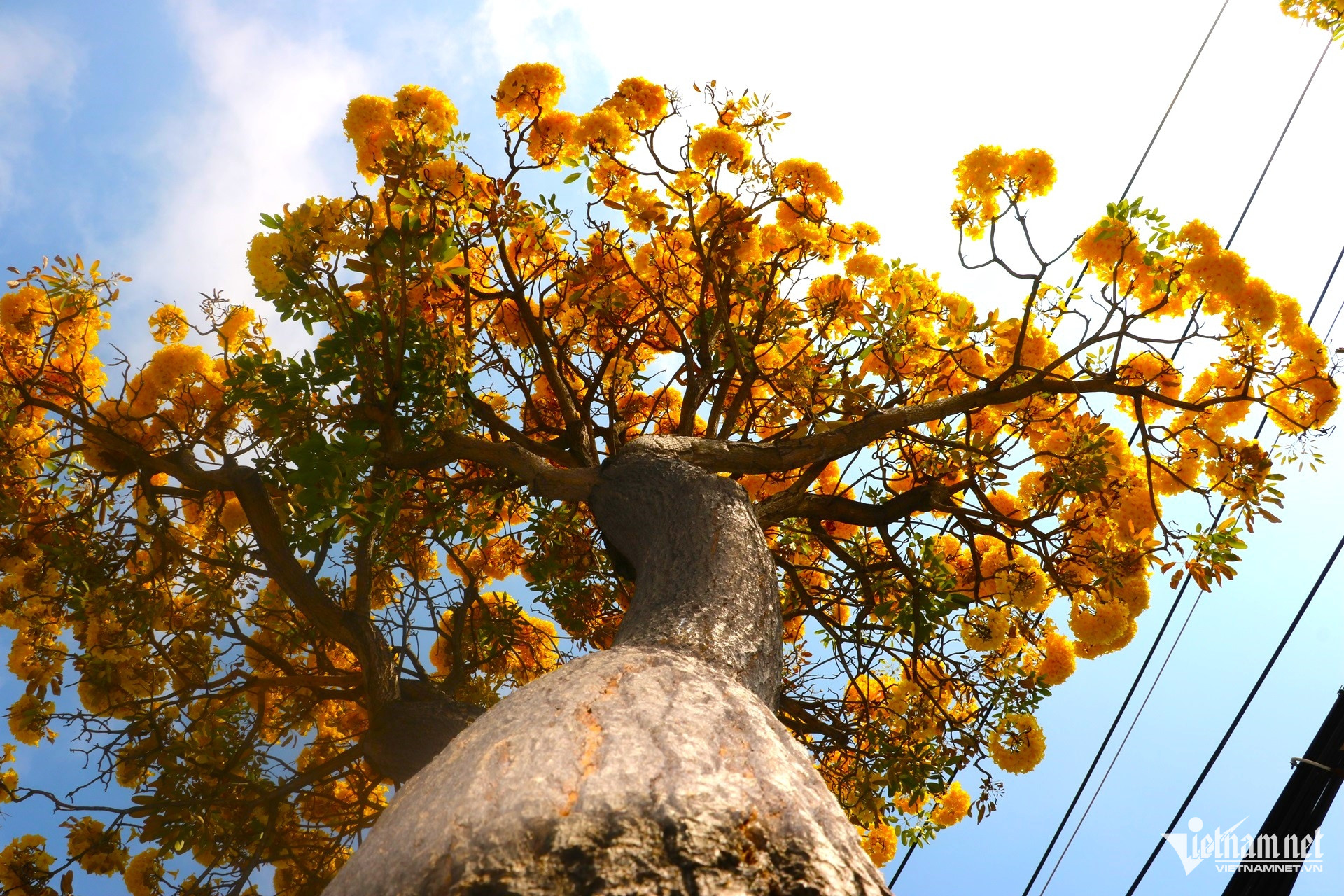 Hoa nở thành chùm màu vàng tươi, hình chiếc chuông, rực rỡ phủ kín tán cây, nổi bật giữa nền trời xanh
