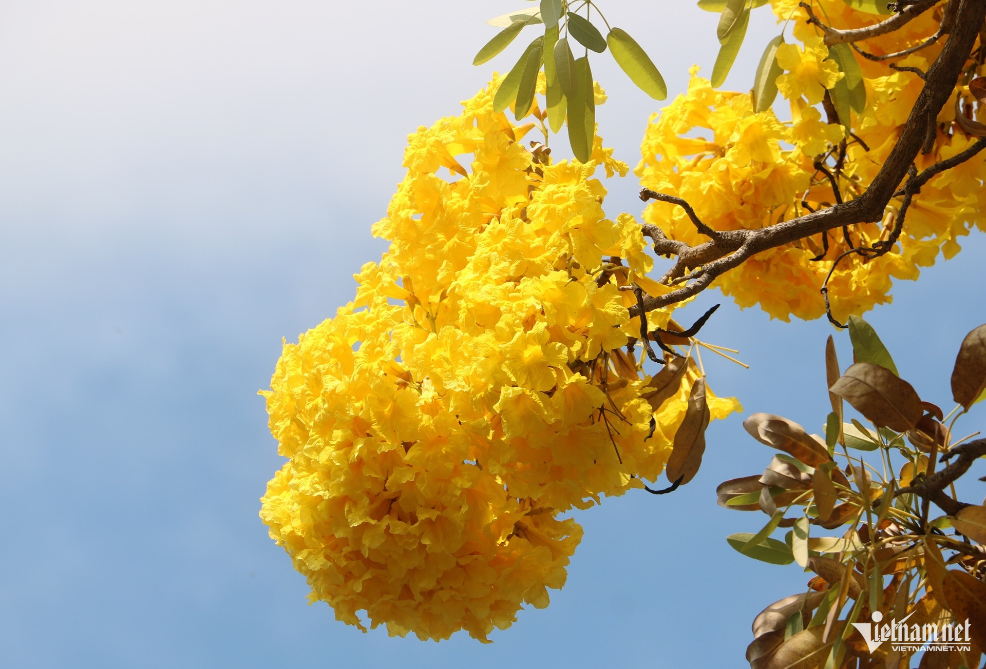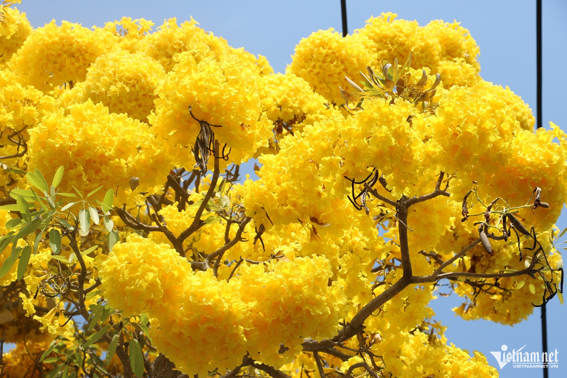Trên tuyến đường này, hơn 200 cây phong linh đang bước vào thời điểm nở rộ nhất. Từng chùm hoa vàng tươi rực rỡ phủ kín tán cây, nổi bật giữa nền trời xanh.
